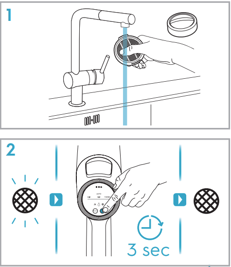 Efter att ha rengjort filtret, återställ indikatorn genom att trycka och hålla in ON/OFF-knappen i ungefär 3-5 sekunder.