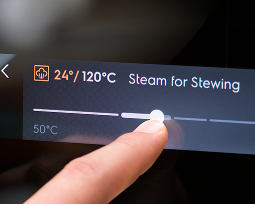 Välj bara Steamify®-funktionen och ställ in temperaturen med skjutreglaget på displayen. Detta bör vara den temperatur du normalt använder när du lagar mat med varmluft, eller som anges i receptet. Baserat på temperaturen ställer ugnen automatiskt in ångnivån åt dig.