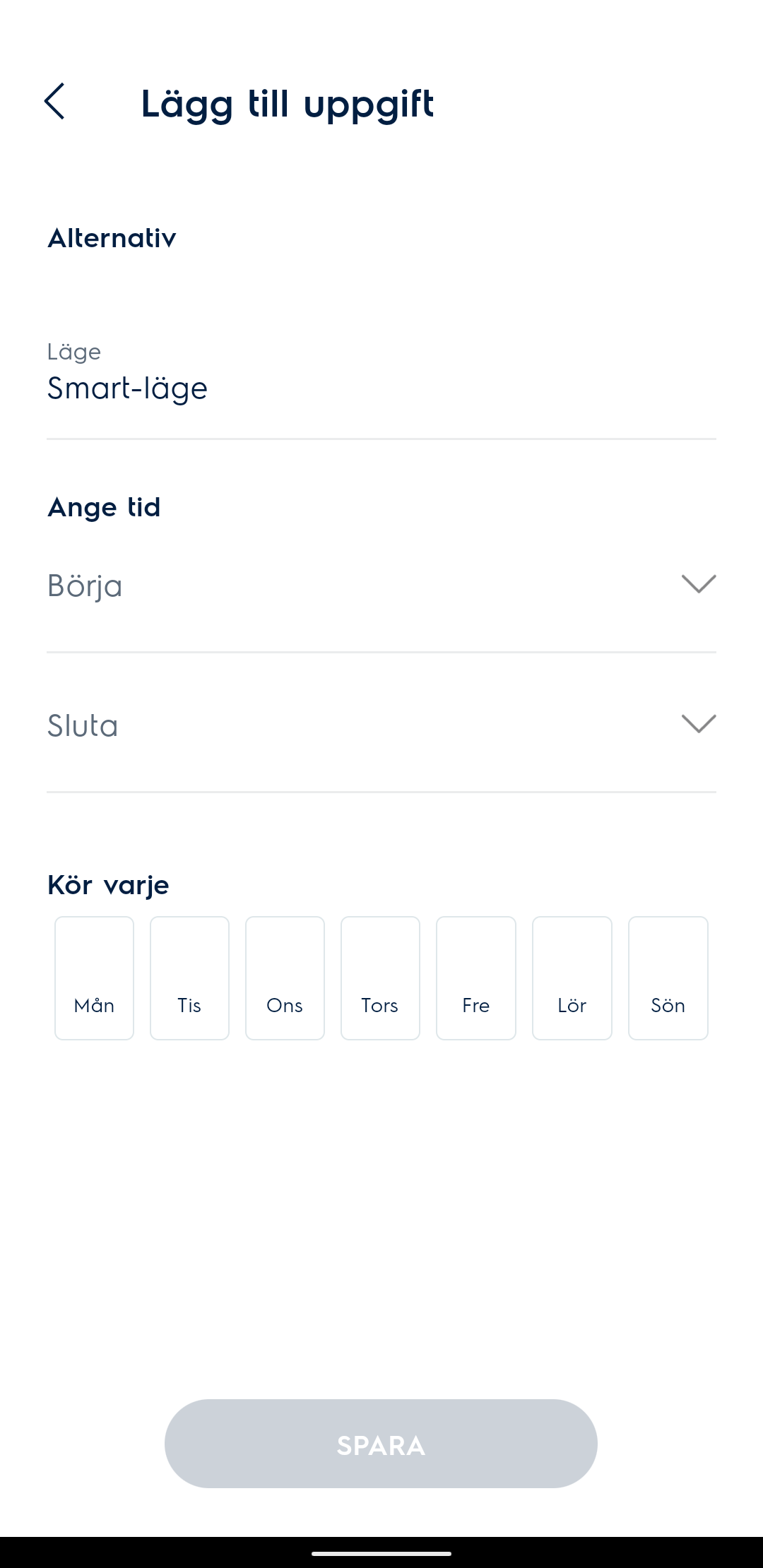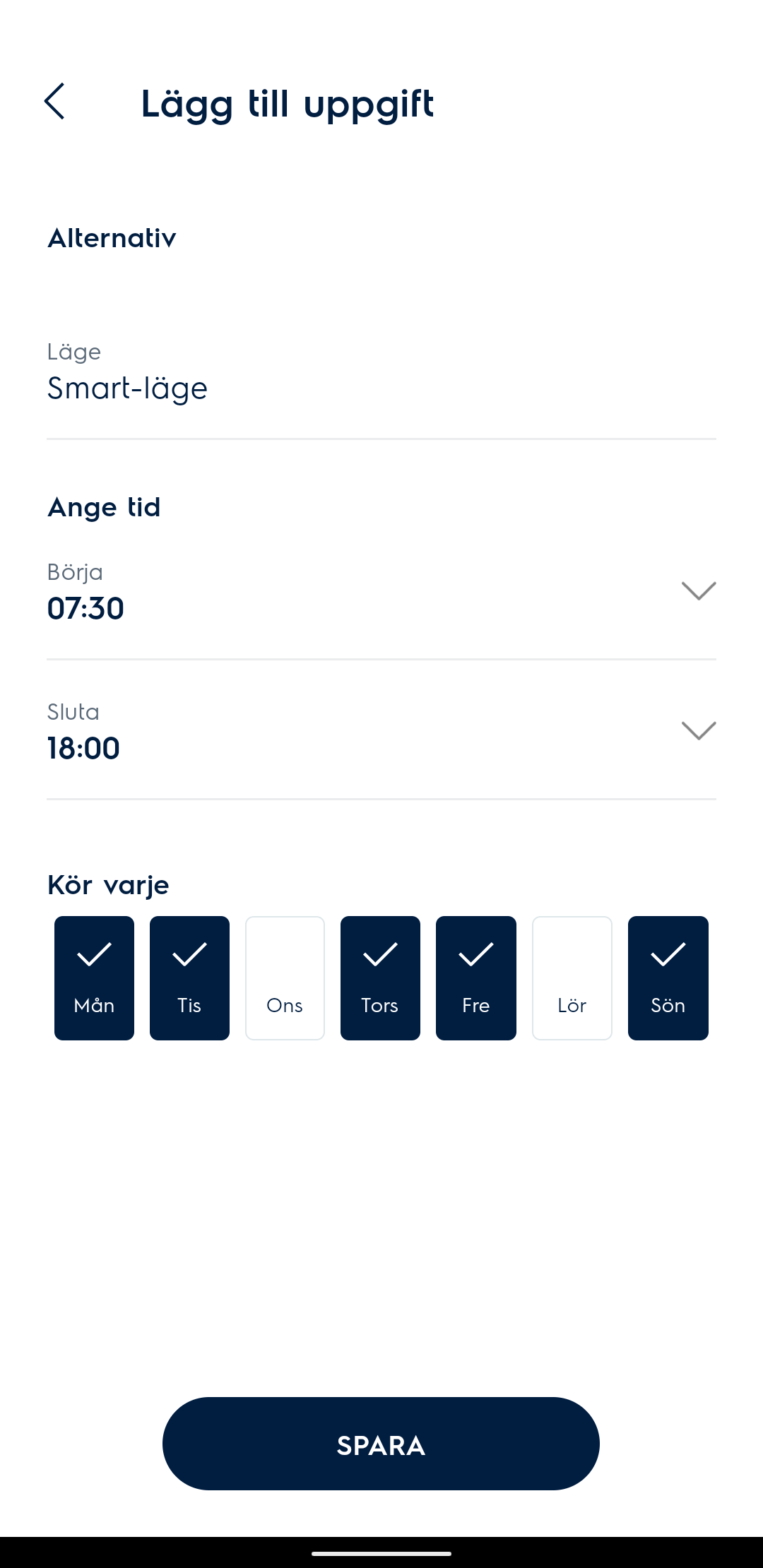 - När du valt läge, starttid, sluttid samt dagar tryck på Spara