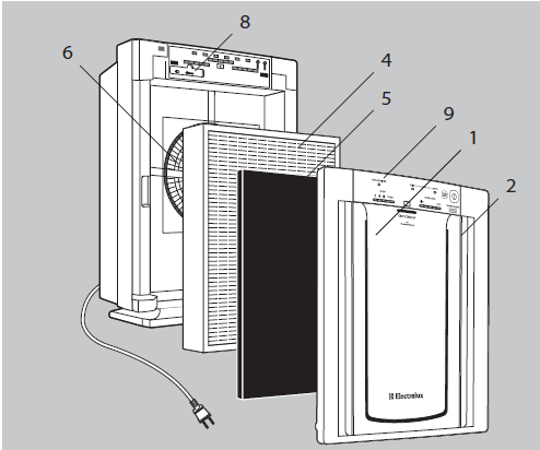 - När man bytt HEPA-filter på luftrenaren så behöver man trycka på återställningsknappen (8) i fem sekunder tills en signal hörs