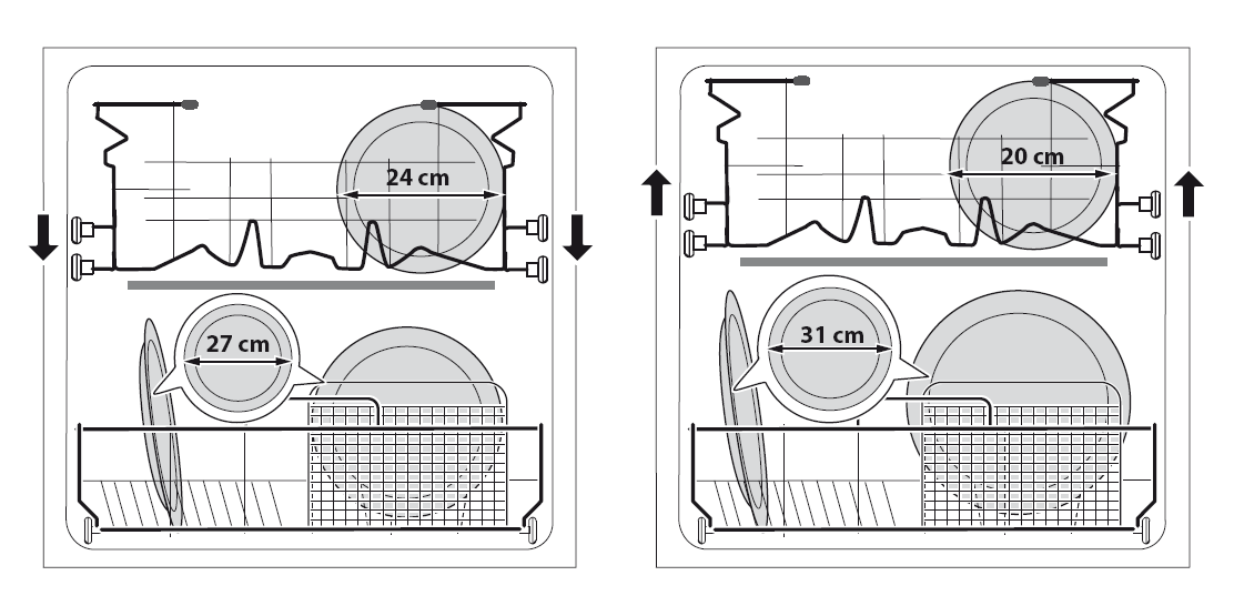 - Vi räknar med att tallrikarna inte överstiger 27 cm i diameter. Om det går att höja överkorgen så kan det få plats med tallrikar på 31 cm i diameter, se bild nedan