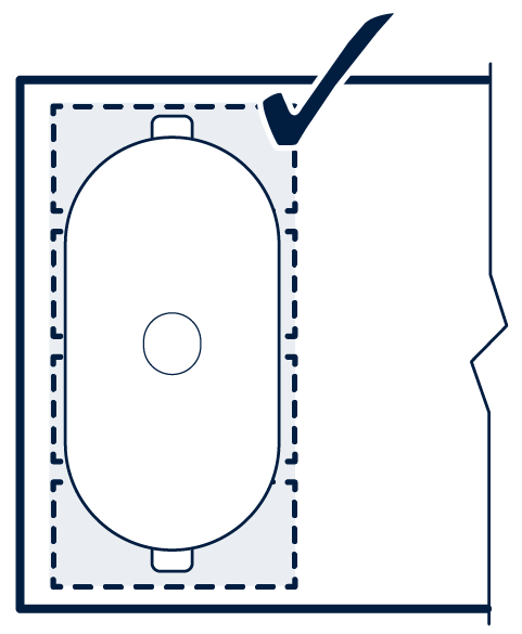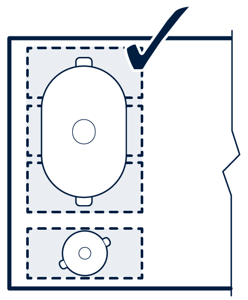 Placera kokkärlen inom kokområdet. Kokkärlet måste täcka minst tre av de fyra sammanhängande sektionerna. Om du använder för små kokkärl på den stora kokytan kommer displayen att blinka och zonen stängs av efter 1 minut.
