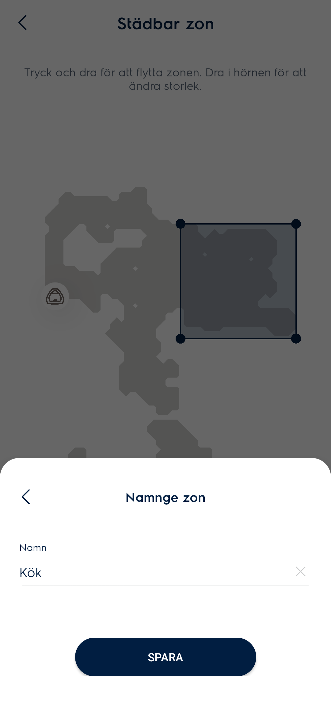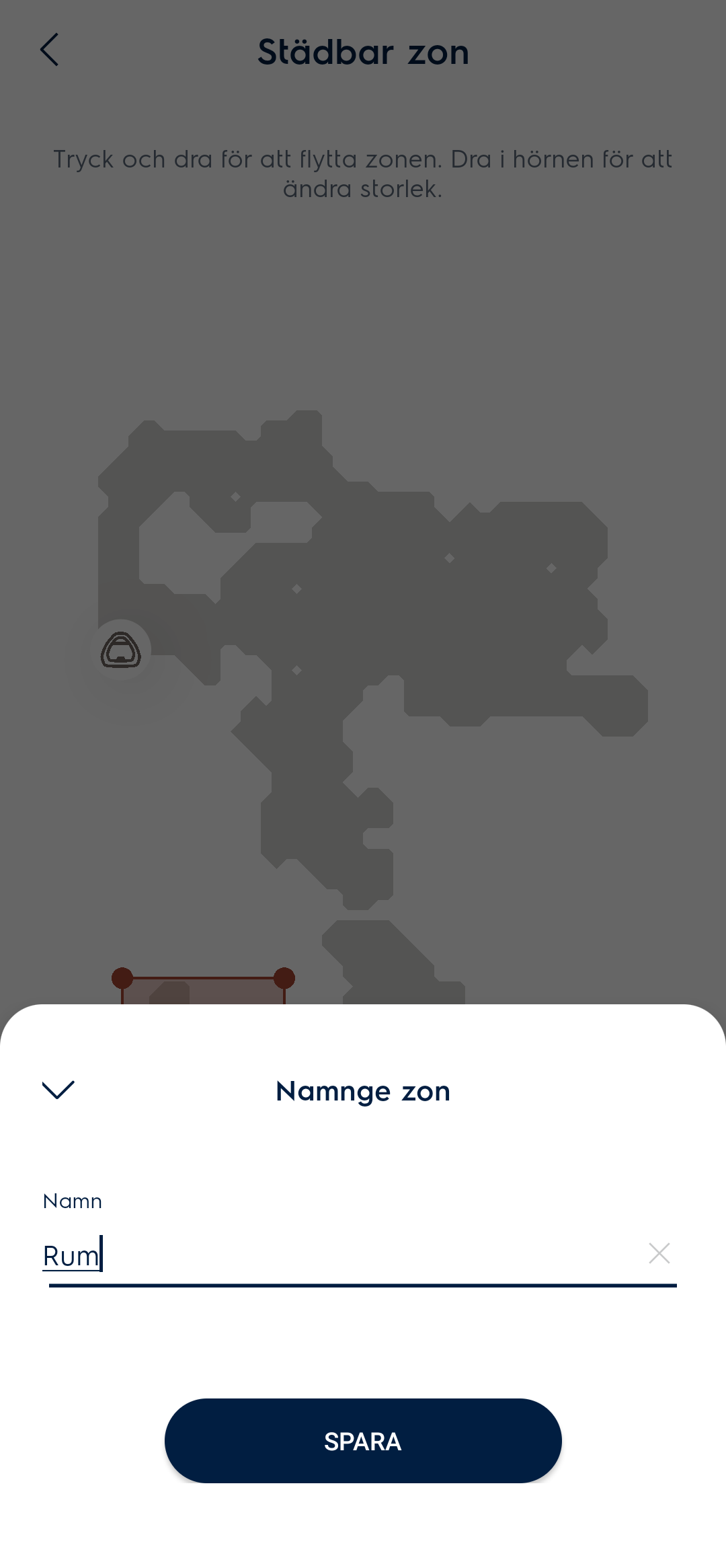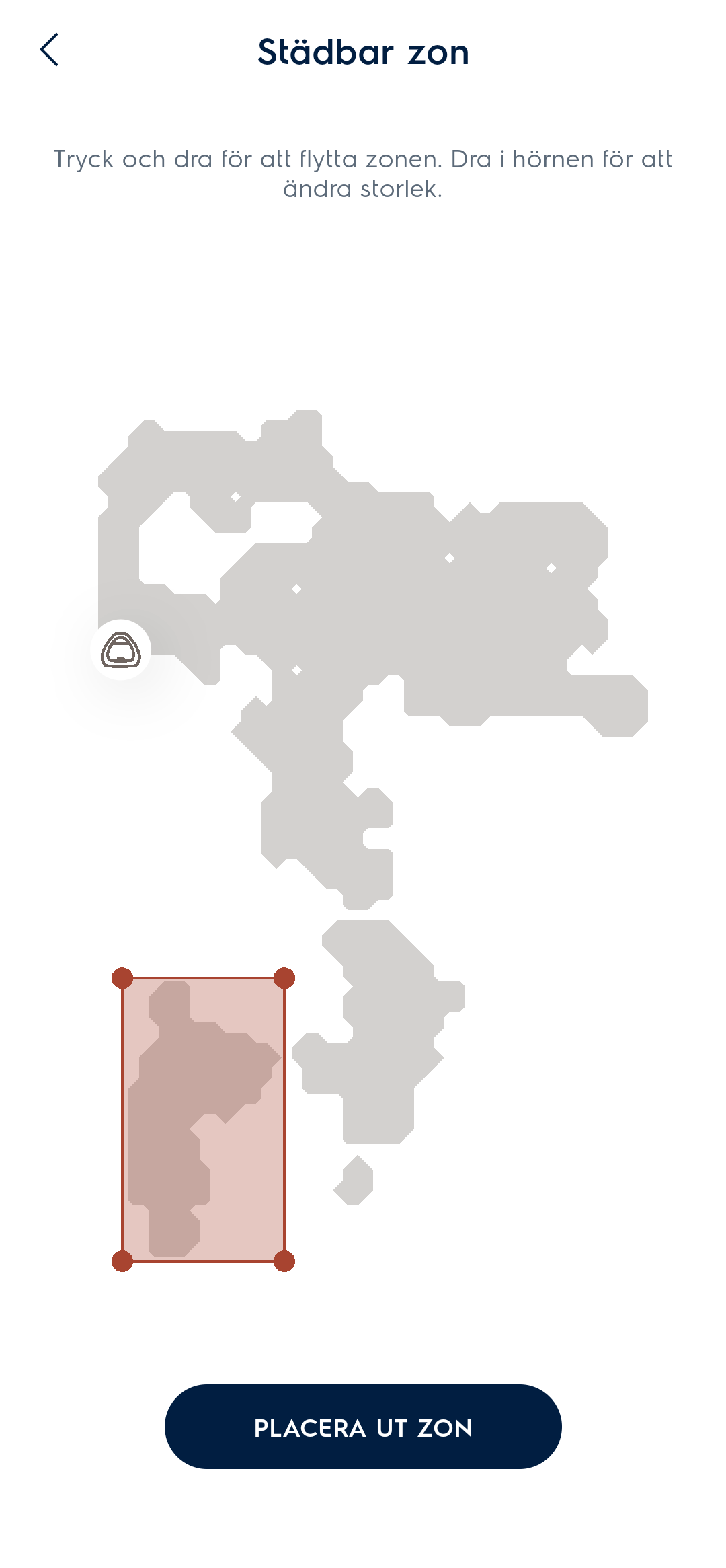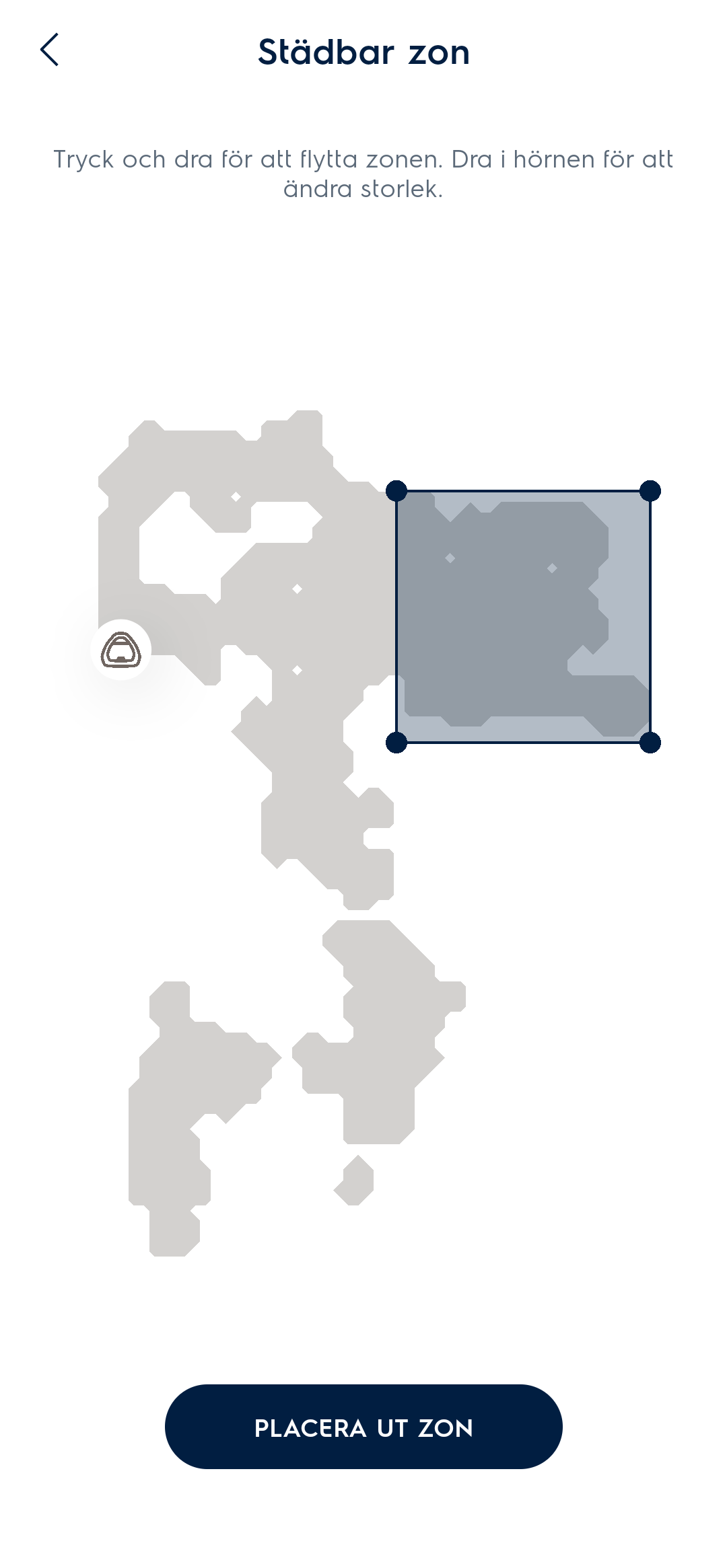 - Flytta och ändra storleken på den zonen du önskar ska städa, tryck sedan på Placera ut zon