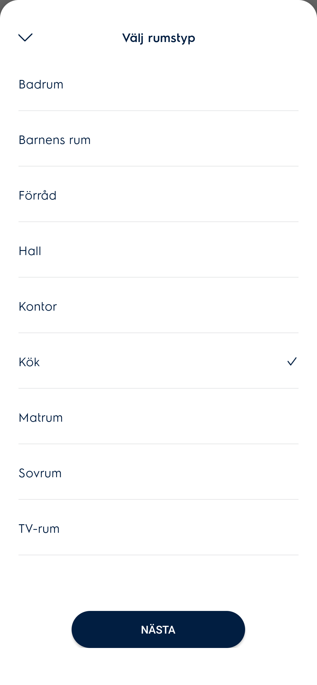 - Välj en rumstyp, tryck sedan på Nästa