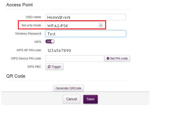 - Inställningarna i routen ska se ut som på bild nedan. WPA2-PSK ska det stå i Security mode