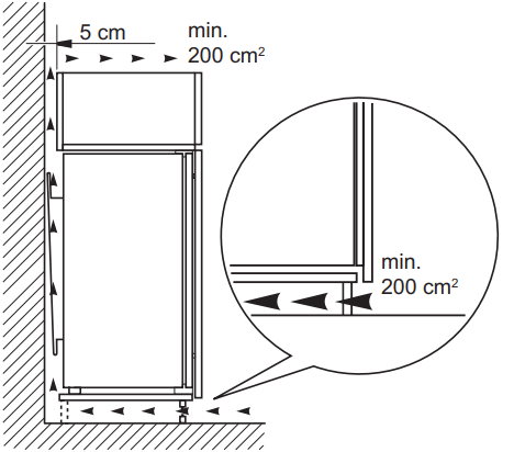 På grund av dess fysiska egenskaper rör sig varm luft som kommer ut från kyl-frysskåpets baksida uppåt. Därför är det nödvändigt att tillhandahålla tillräckligt med utrymme ovanför enheten för att tillåta fritt luftutbyte.
